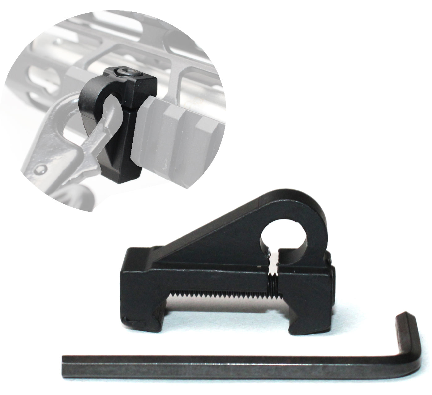 This Sling Hook Rail Mount is constructed of 6061-T6 aluminum with a Hard Anodized Black finish. The 0.27" loop can accommodate most sling hooks, including HK style hooks. It's lightweight and measures 1.2" long.